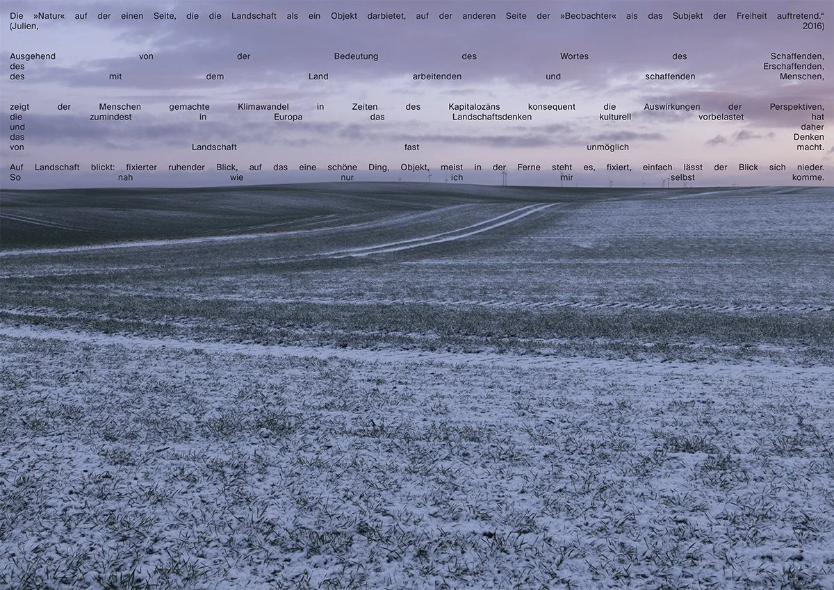 In landscape. Photography. A wide view that sweeps over me and that I let wander as I pause and realise what beautiful colours this desolate landscape is wrapped in. Kilometres of vastness. Wrapped in a feeling of the insurmountability of uniformity. I long for the diversity of the landscape. Everything around me is alive, no more or less important than my own aliveness. Seeking freedom is a must. A culture. A surface. A space of capital interests and the question of one's own interests.